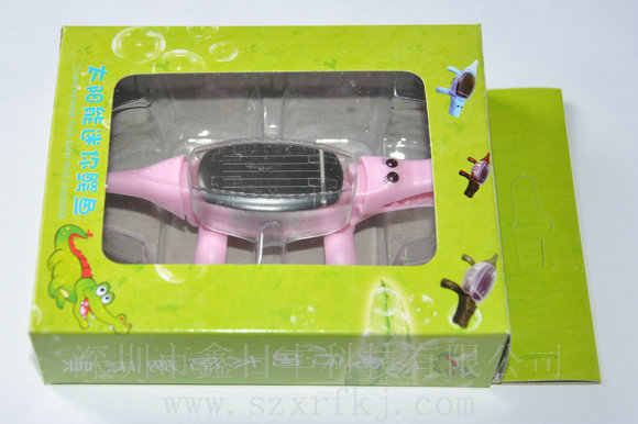 会爬行的太阳能玩具-太阳能迷你鳄鱼 这只温柔的太阳能鳄鱼,在阳光下可以悠闲自由,摇头摆尾地向前爬动.无需电池.专利设计,可爱、新颖、时尚、节能、环保。 老少皆宜的送礼佳品,也是宣传环保节能概念,启蒙益智的首选太阳能产品。 该玩具造型可爱,平时摆在办公桌上也是非常不错的装饰。 它靠吸食太阳能、光能,不用蓄电池,在光能下直接驱动微型振动电机,达到昆虫特定的振动效果。 以下为包装盒!