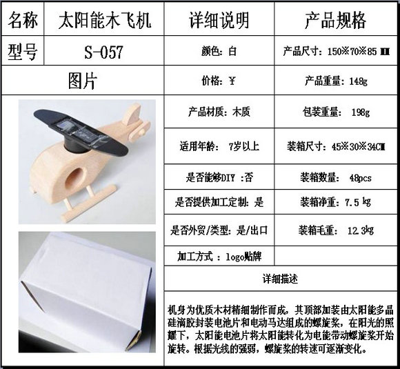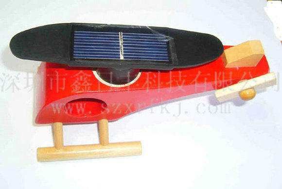 机身为优质木材精细制作而成,其顶部加装由太阳能多晶硅滴胶封装电池片和电动马达组成的螺旋桨,在阳光的照耀下,太阳能电池片将太阳能转化为电能带动螺旋桨开始旋转。根据光线的强弱,螺旋桨的转速可逐渐变化。太阳能玩具小飞机整体造型简洁流畅,适合摆放在汽车、窗台等阳光充足的场所,为您的生活空间更添一分阳光般的温暖与情调。太阳能木制飞机玩具,形象生动。既可以作为学生教学,寓教于乐;又可作为工艺品,放于窗台、阳台;如摆在酒柜射灯下,更是栩栩如生。