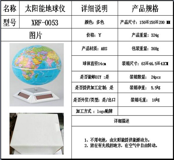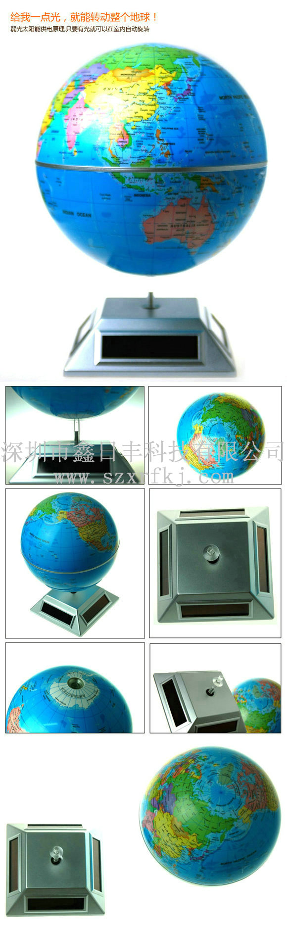 详细说明: 阿基米德说,给我一个支点,我就能翘起地球。麦极说,给我一点阳光,我就能转动地球。不过,此地球非彼地球。这是一个地球仪。只需要一点点室内光,它就可以规律旋转,即使作为家中一个工艺品,也并不难看。 工作原理: 采用高科技合成胶材料经特殊工艺加工精心制造,外形典雅高贵,地理精确。 采用弱光太阳能供电原理,只要有光就可以在室内自动旋转,没有内设传统电池,环保节能。 不需要任何电源,转速均匀自然,观看清晰悦目。 适合人群: 送礼、家居、办公,学校启蒙学生太阳能概念的教学用品。