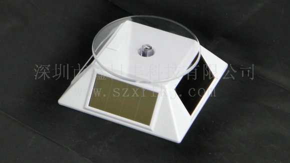 该款太阳能展示台为XRF-041型,该展示台外观大气,四面的太阳能板为55*28MM的大功率太阳能供电板,在500LUX光强下可以负重500克以上,上面还按装了开关,在不使用时可以关掉开关以延长产品的寿命,该产品可以用做负重较重的产品展示,性能优,旋转效果好,环保,时尚,为传统展示台的替代品.