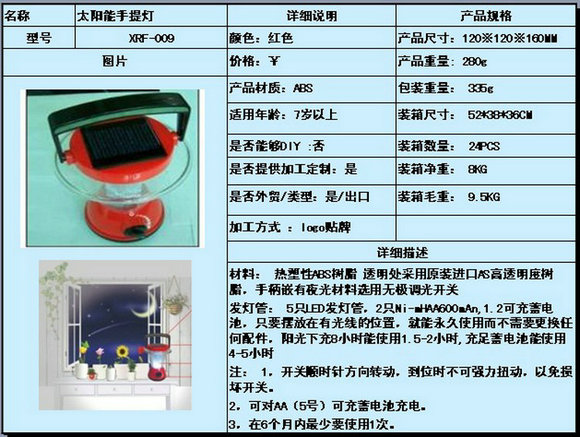 发灯管: 5只LED发灯管,2只Ni-mHAA600mAn,1.2可充蓄电池,只要摆放在有光线的位置,就能永