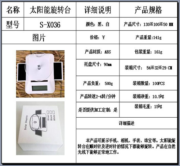 1.适合于:珠宝、手饰、手表、手机、MP3、MP4、NP5、数码相机等产品的展示。几乎只要有光线就能转动,可增添活跃气氛,使商品引人注目.