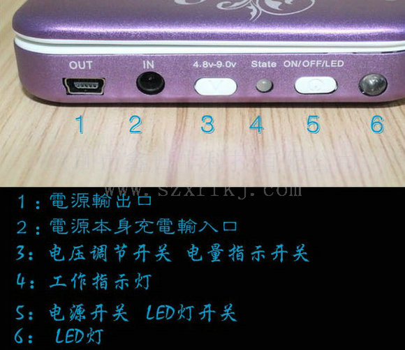 2、当给您的手机或数码产品充电前,请仔细查看您的产品说明书或电源适配器,了解您产品的充电电压,然后按ON/OFF按钮(3秒一5秒)即可开机,开机时,红色LED电压指示灯亮,开机后产