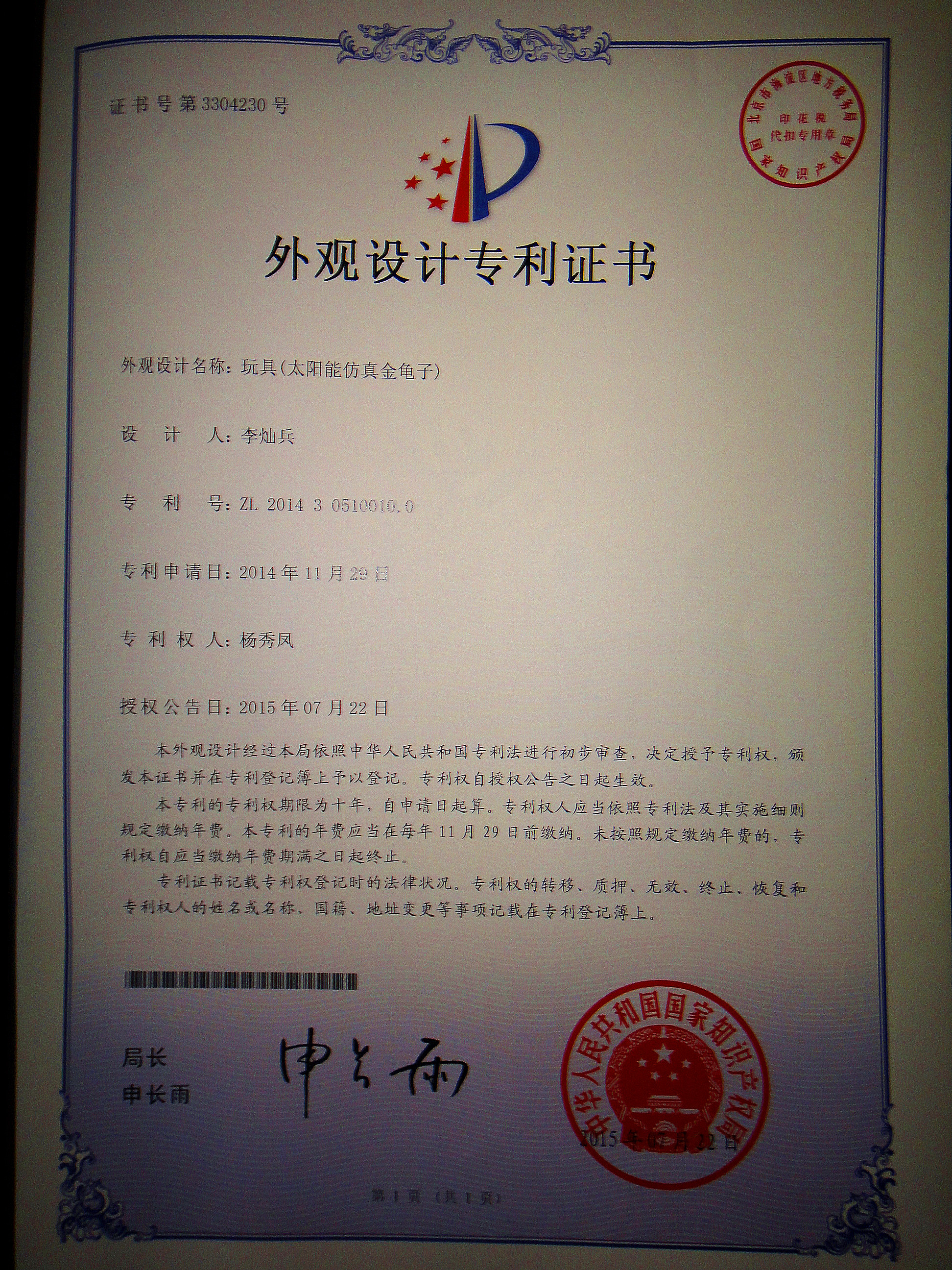 产品专利证书