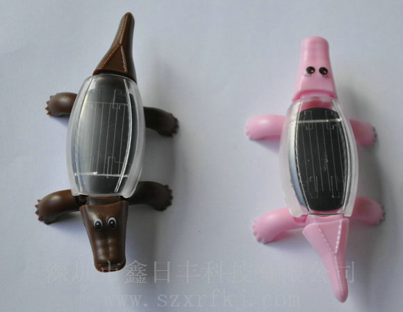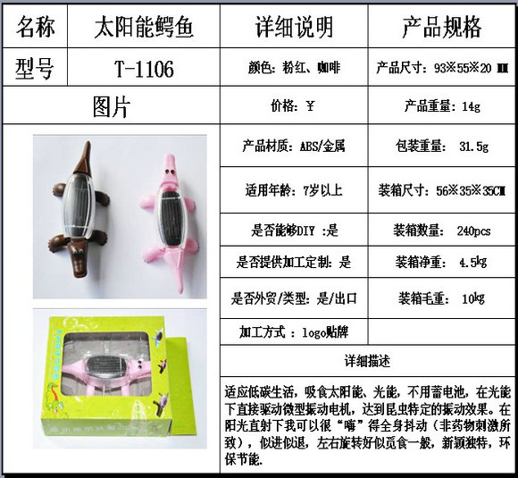 会爬行的太阳能玩具-太阳能迷你鳄鱼 这只温柔的太阳能鳄鱼,在阳光下可以悠闲自由,摇头摆尾地向前爬动.无需电池.专利设计,可爱、新颖、时尚、节能、环保。 老少皆宜的送礼佳品,也是宣传环保节能概念,启蒙益智的首选太阳能产品。 该玩具造型可爱,平时摆在办公桌上也是非常不错的装饰。 它靠吸食太阳能、光能,不用蓄电池,在光能下直接驱动微型振动电机,达到昆虫特定的振动效果。 以下为包装盒!