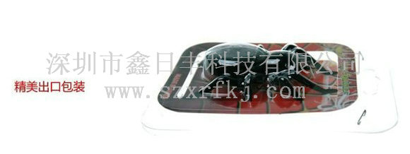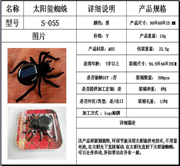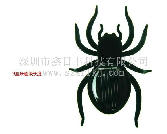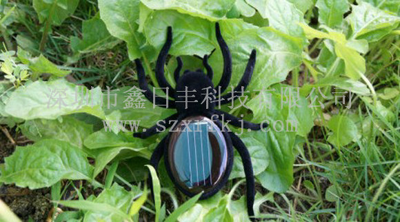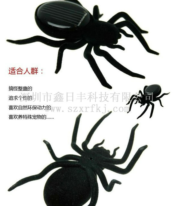 该产品采用太阳能供电技术,不用蓄电池,在太阳光下直接驱动微型振动电机,达到产品特定的振动效果,在太阳光直射下太阳能蜘蛛可以全身抖动,好似要出击扑食一般,产品即新颖独特,环保节能,又是学校启蒙学生太阳能概念的良好教学用品..