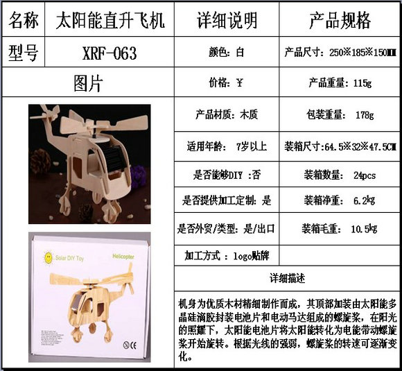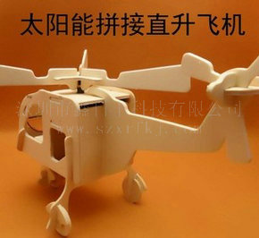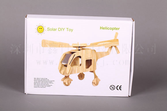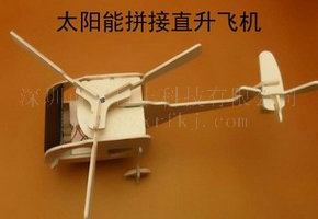 太阳能拼装木飞机是我公司推出的一款儿童益智玩具,机身为优质木材精细制作而成,其顶部加装由太阳能多晶硅滴胶封装电池片和电动马达组成的螺旋桨,在阳光的照耀下,太阳能电池片将太阳能转化为电能带动螺旋桨开始旋转。根据光线的强弱,螺旋桨的转速可逐渐变化。太阳能玩具小飞机整体造型简洁流畅,适合摆放在汽车、窗台等阳光充足的场所,为您的生活空间更添一分阳光般的温暖与情调。太阳能木制飞机玩具,形象生动.既可以作为学生教学,寓教于乐;又可作为工艺品,放于窗台,阳台;如摆在酒柜射灯下,更是栩栩如生.该产品环保,节能,又是学校启蒙学生太阳能概念的良好教材