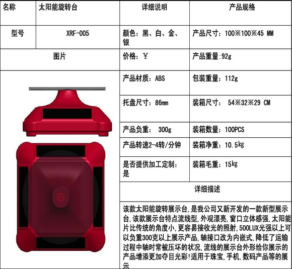 该款太阳能旋转展示台,是我公司又新开发的一款新型展示台,该款展示台特点流线型,外观漂亮,窗口立体感强,太阳能片比传统的角度小,更容易接收光的照射,500LUX光强以上可以负重300克以上展示产品,轴接口改为内嵌式,降低了运输过程中轴时常被压坏的状况,流线的展示台外形给你展示的产品增添更加夺目光彩!适用于珠宝,手机,数码产品等的展示.