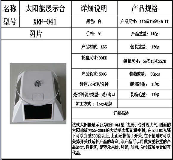 该款太阳能展示台为XRF-041型,该展示台外观大气,四面的太阳能板为55*28MM的大功率太阳能供电板,在500LUX光强下可以负重500克以上,上面还按装了开关,在不使用时可以关掉开关以延长产品的寿命,该产品可以用做负重较重的产品展示,性能优,旋转效果好,环保,时尚,为传统展示台的替代品.