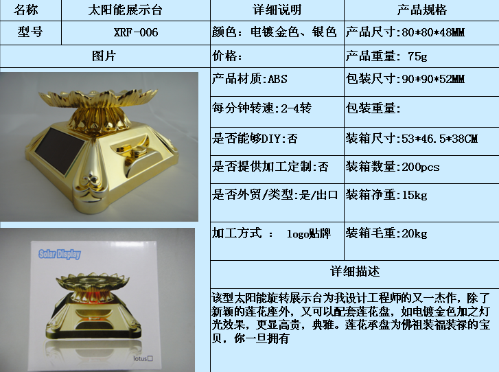 该型太阳能旋转展示台为我设计工程师的又一杰作,除了新颖的莲花座外,又可以配套莲花盘,如电镀金色加之灯光效果,更显高贵,典雅。莲花承盘为佛祖装福装禄的宝贝