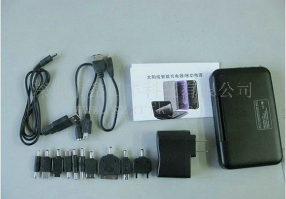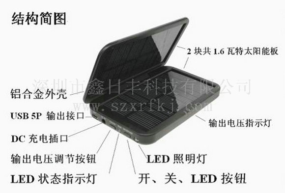 本产品是一款多用途的太阳能智能充电器/移动电源,内置高容量可充电聚合物锂电池,太阳能电池板功率最高可达1.6w。通过智能MCU输出多组电压,可随时随地对你的手机、数码相机、PDA、PSP、GPS、DV、MP3、MP4家庭节能设备等进行充电或供电。本产品具有安全可靠,容量大,寿命长,功能多等优点。金属外壳设计、时尚高雅、携带方便。
