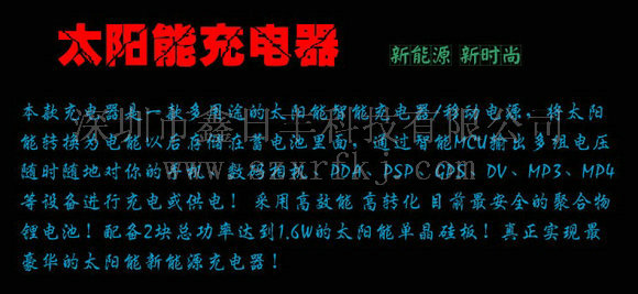 1、适合于手机、数码(摄)相机、MP3、MP4、MP5、掌上电脑(PDA)、IPC、PSP、收音机、便携式CD、ipod、移动DV、GPS等等需要充电的产品,特别适用于当您在野外作业或旅游中或者遇到停电时的应急场合,此时太阳能环保充电器将会帮您的大忙,使您的数码产品随时随地保持工作状态,让您不间断的与您的朋友和家人保持联系。