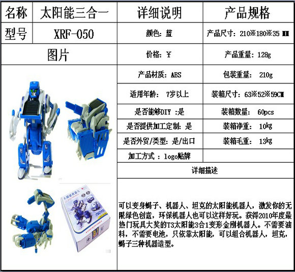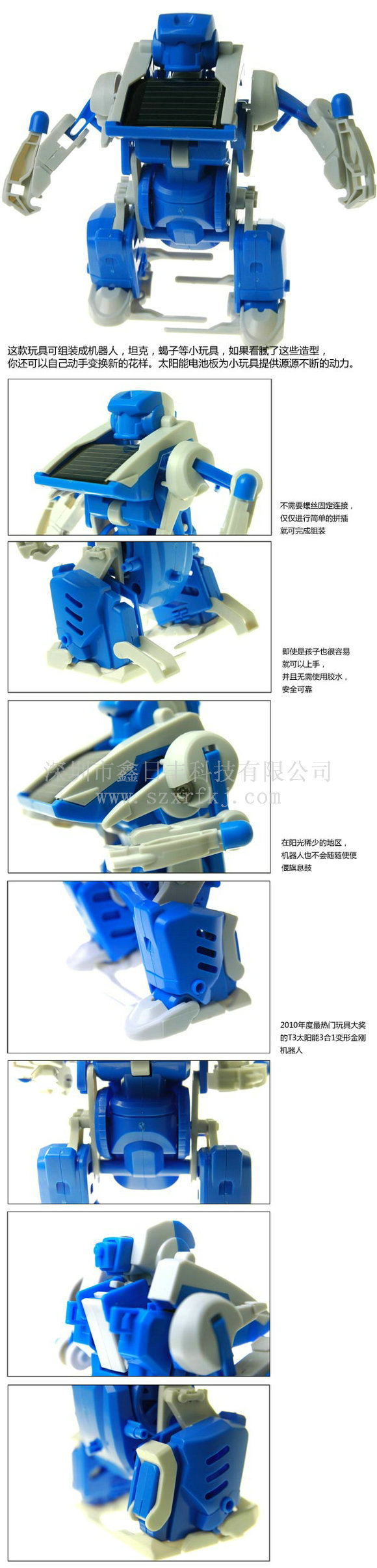 继火遍全球的6合1太阳能玩具之后,又一个重磅太阳能玩具推出了!获得2010年度最热门玩具大奖的T3太阳能3合1变形金刚机器人登场了!不需要油料,不需要电池,完全依靠太阳能,可以组合机器人,坦克,蝎子三种机器造型,最新超低价上市!超好玩哦!